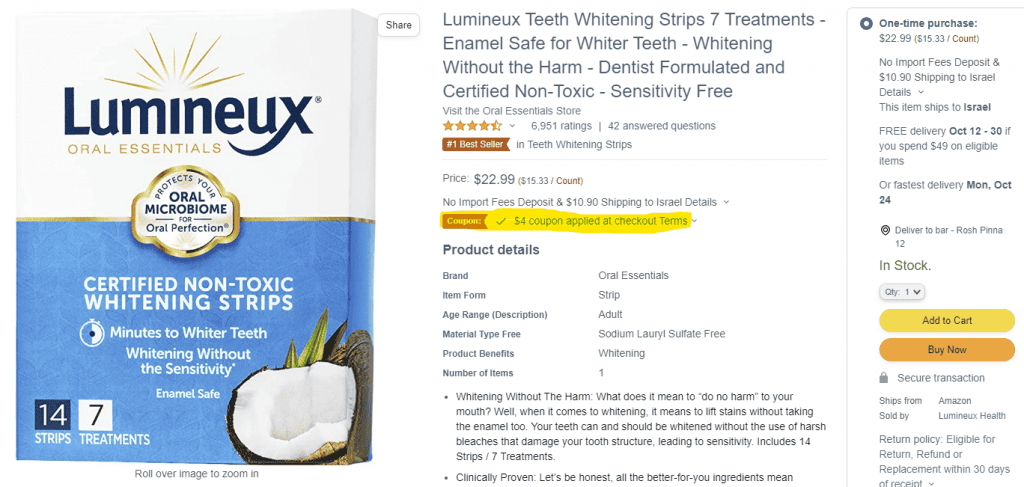 2. קופונים שנמצאים בדף מוצר– אתם צריכים ללחוץ על הקופון כדי שההנחה תתווסף לכם לסל.