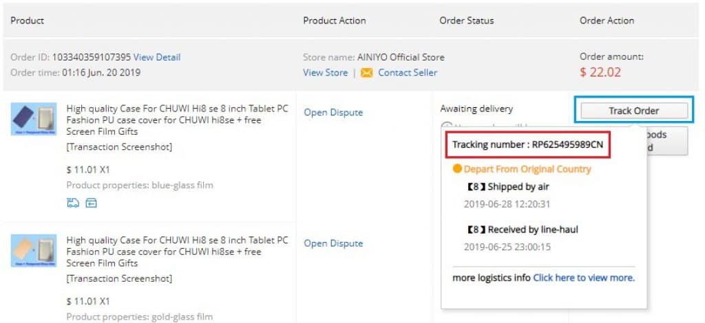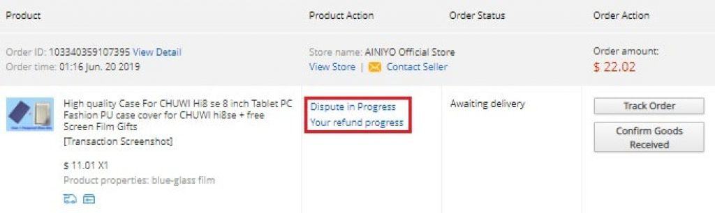 על מנת לעקוב אחר ה"תלונה" תוכלו להכנס להזמנות שלכם וללחוץ על "Dispute in progress"