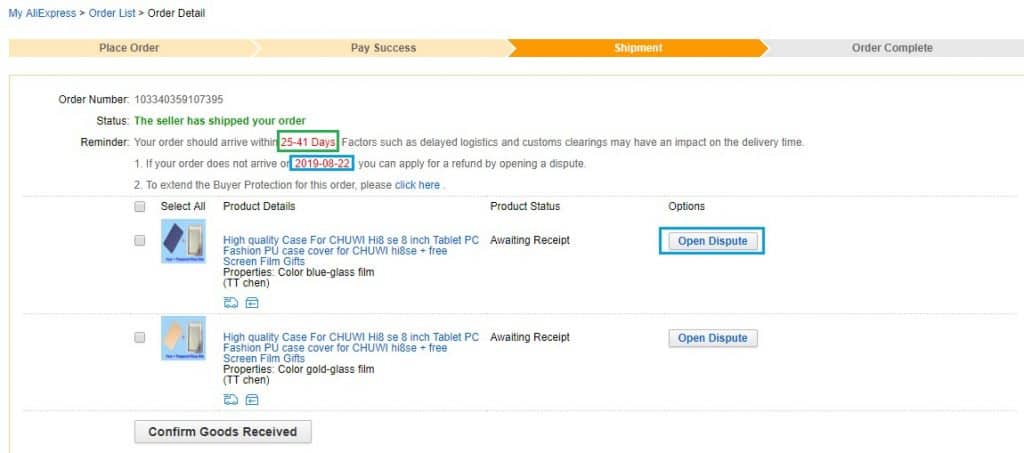 בכל קנייה יש פרק זמן שבו הקנייה בטוחה עד 50-60 ימים -זהו פרק הזמן בו הקונה יכול לפתוח "דיספיוט" ,לקראת סוף "זמן הגנת הצרכן" תהיה לכם האפשרות להאריך לעוד כמה ימין , במידה ואתם לא רואים את המוצר מגיע בקרוב תפתחו ישר דספיוט וזאת מאחר ואם מסתיים הזמן המוקצב לא תוכלו לפתוח תלונה .