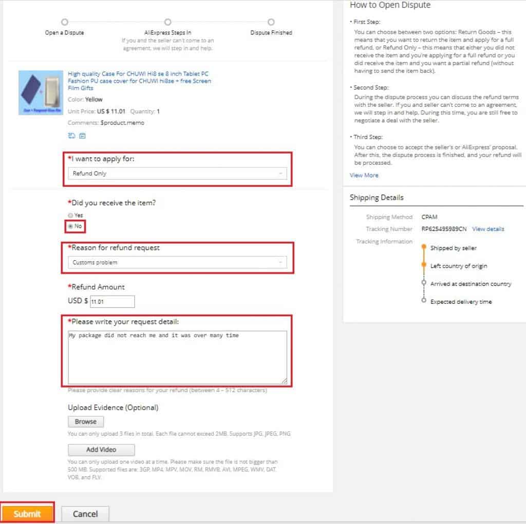 בחלון הבא סמנו את גובה ההחזר שאתם מעוניינים לקבל, אנחנו ביקשנו החזר מלא Full Refund, מפני שהחבילה לא הגיעה, לאחר מכן, הקלידו את הסיבה שבגללה החלטתם לפתוח תלונה (באנגלית כמובן),תוכלו לצרף לתלונה שלכם תמונות (Add Attachments) הוסף קבצים וגם וידאו (מומלץ להוסיף תמונות במידה והמוצר הגיע פגום) , לאחר מכן לחצו על Submit