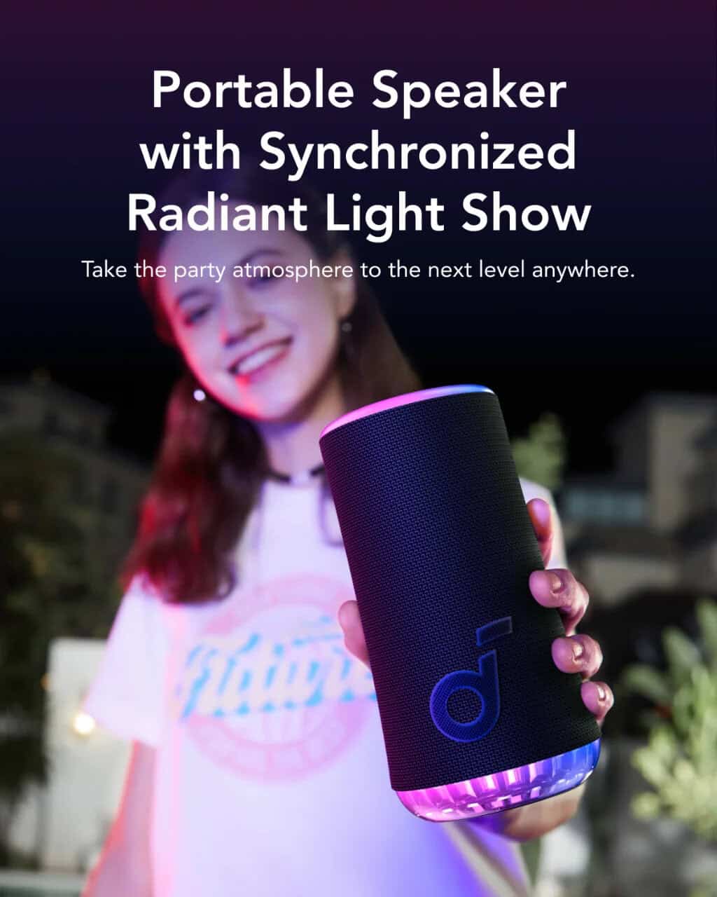 רמקול Glow של Soundcore מציע חוויית סאונד היקפית של 30W עם מופע אורות מסונכרן למוזיקה. עמיד למים ואבק בתקן IP67, עם סוללה המחזיקה עד 18 שעות ואפשרות לחיבור מעל 100 רמקולים יחד לחוויה מושלמת.